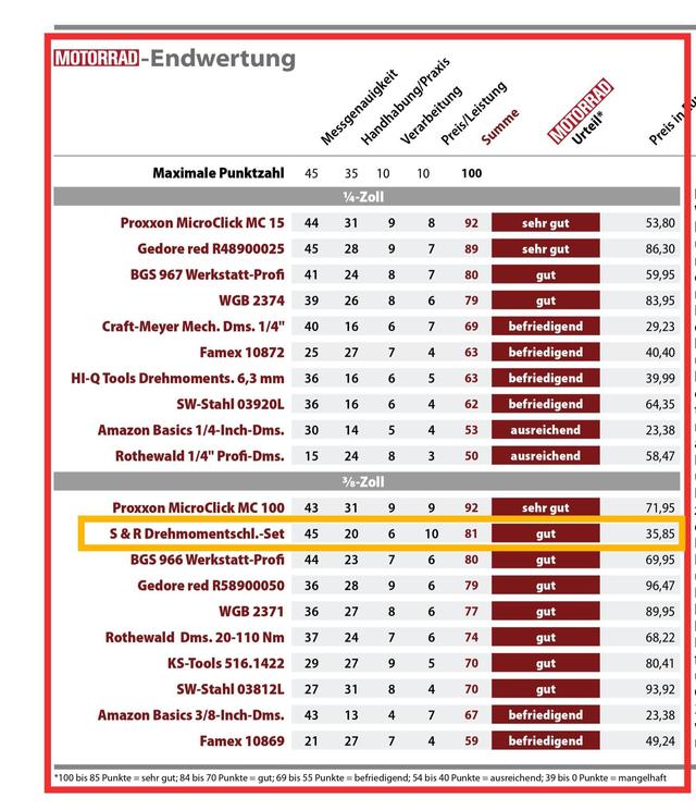 З тестування німецького журналу Motorrad від 11/09/2020 р. динамометричний ключ S&R 3/8" має високу точність за низької ціни серед інших конкурентів.
